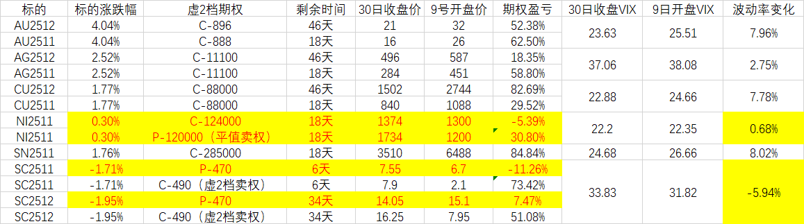 这次国庆节跟踪了金银、铜镍锡、原油的部分期权,如下图。