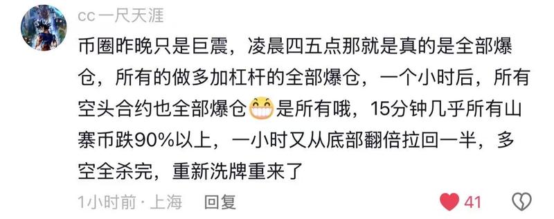 - 10月11日凌晨5点19分,市场恐慌情绪达到顶峰,比特币在一分钟内暴跌超4%,下跌近5000美元,极端行情出现,其他山寨币出现更大幅度的瀑布