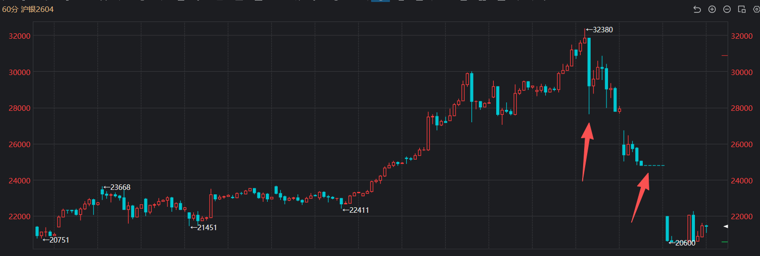 再就是29日晚上沪银在23:00到23:30的半个小时内闪崩,急速下挫-13.27%,然后开始反弹,并在次日早上开盘前几乎要收回跌幅。但30日早上,沃什交易的叙事开始传播,沪银面临卸杠杆的压力,并在30日晚上被按在跌停板上。